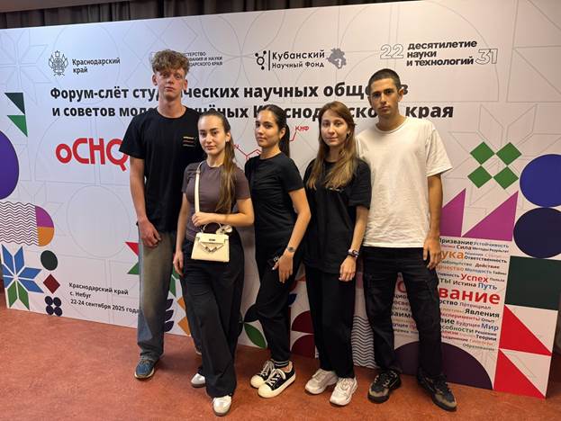 Студенты филиала ФГБОУ ВО «Кубанский государственный университет» в г. Новороссийске: Велунц Кристина, Исмаилова Адиле, Клевцова Анна, Письменный Евгений и Кашанян Генри с 22-24 сентября 2025г. стали участниками в форуме-слете студенческих научных обществ и советов молодых ученых Краснодарского края «оСНОвание».
